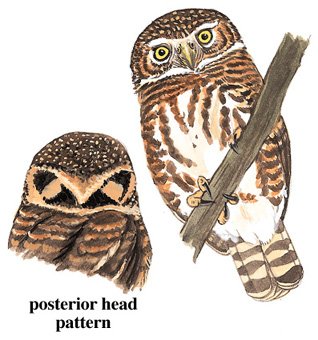 物种特征:描述:纤小(16厘米)而多横斑,眼黄色,颈圈浅色,无耳羽簇。上体浅褐色而具橙黄色横斑;头顶灰色,具白或皮黄色的小型"眼状斑";喉白而满具褐色横斑;胸及腹部皮黄色,具黑色横斑;大腿及臀白色具褐色纵纹。颈背有橘黄色和黑色的假眼。 虹膜-黄色;嘴-角质色;脚-灰色。 叫声:昼夜发出圆润的单一哨音pho, pho-pho pho。仿其叫声可非常容易地招引此鸟,也会引来那些围攻领鸺鶹的小型鸣禽。 分布范围:喜马拉雅山脉至中国南部、东南亚、苏门答腊及婆罗洲。 分布状况:常见于海拔800~3500米间的各类森林。指名亚种为西藏东南部、华中、华东、西南、华南、东南和海南岛的留鸟;paradalotum于台湾。 习性:白日里发出叫声或遭受其他鸟的围攻时可见此鸟于高树。夜晚栖于高树,由凸显的栖木上出猎捕食。飞行时振翼极快。