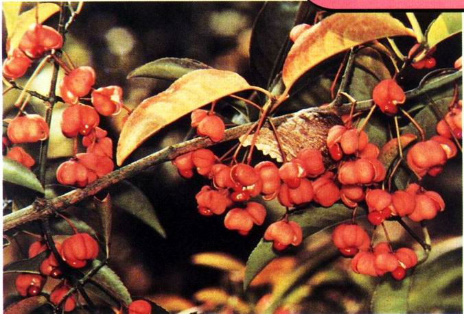 形态特征:卫矛科卫矛属落叶小乔木植物,高5-10米。叶对生,矩圆状椭圆形、矩圆状卵形或矩圆状披针形,长7-12厘米,宽3-7厘米。聚伞花序有5至多朵花,花白绿色,直径约1厘米。蒴果粉红带黄,倒三角形,直径1厘米以上,种子1-2粒,红棕色,有橙红色假种皮。