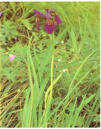形态特征:鸢尾科鸢尾属多年生草本植物。根状茎圆柱形。叶基生,条形,长25-70厘米,宽0.5-1.2厘米。花茎高25-50厘米,顶生苞片3枚,内含2朵花,6-7月开花,花深蓝紫色,直径8-12厘米;外花被裂片狭倒卵形或长圆形,长5.5-7厘米,宽2.5-3.5厘米,有金黄色条纹,内花被裂片狭倒披针形,长约6厘米,宽约1厘米。蒴果三棱状圆柱形,长4-6厘米,直径1.7-2厘米。种子近梨形,棕褐色。