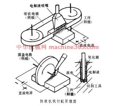 为阳极机械切割的原理。以金属钢带或圆盘为切割工具(材料为碳钢或黄铜)﹐它作为阴极与直流电源负极相连。被切割工件作为阳极﹐与直流电源正极相连。切割时在切口处供以水玻璃(硅酸钠)电解液。高速旋转的切割工具切向工件。在直流电源的作用下﹐工件切口表面的金属因电解作用生成氧化膜﹐并被高速旋转的切割工具不断刮除﹐被电解液带走。切口表面的某些凸起点与工具之间还伴随着电弧放电﹐金属被高温熔化﹑气化而蚀除﹐也随电解液带走﹐切割工具便逐渐切入工件内﹐直至切断。阳极机械切割机床一般有盘式和带式两种。带式机床适合于切割大型工件或多件同时切割﹐盘式机床适合于小型工件(一般直径在200毫米以下)和单件的切割。阳极机械切割主要用于切割高强度﹑高硬度﹑高韧性或脆性的金属材料﹐如硬质合金﹑耐热合金﹑淬火钢﹑不锈钢﹑磁钢﹑钛合金和铝合金等﹐其特点是切割效率不受工件材料力学性能的影响﹐同时具有对工件材料的热影响小﹑切口无毛刺﹑切缝窄(一般为1.5~2.5毫米)和成本低等优点。但切割精度和表面粗糙度较差﹐工具电极有损耗﹐因而应用不广﹐大多用于切割毛坯或下料。