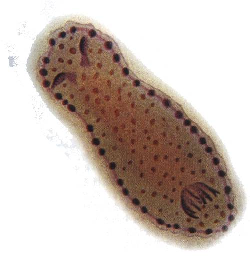 中型个体,体长40毫米。身体近长圆形,扁平。外套宽、边缘较完整,成波形,但腹足后部裸露在外,成舌状。嗅角鞘一对,能缩人嗅角鞘内。口触手小,呈指状,足宽,前端具双摺,前侧缘椭圆形呈尖角状,后端钝圆,生活时常仲出外套后方。身体色泽鲜艳,体表多为黄白色,体背中部散布育许多黄褐色地点。外套周缘内侧有1-2圈紫红色圆斑,腹面乳白色,无斑点。肛门位于身体背中线后端。