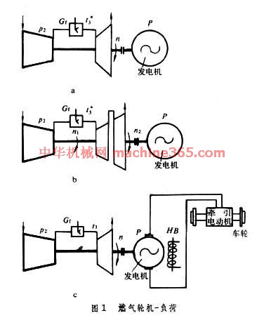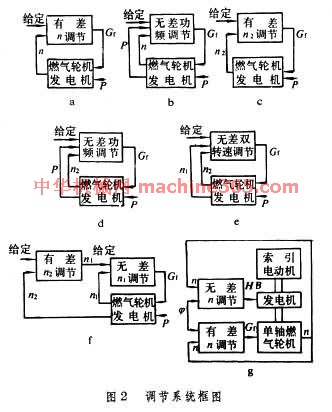 燃气轮机的控制系统包括调节系统﹑操纵系统和保安系统。控制系统的功能是把机器的工况控制在安全允许的范围内﹐以满足负荷方面的要求和机器本身经济性和使用寿命方面的要求。各系统的内容和复杂程度随机器的用途和容量大小而异。机械液压式控制系统曾在燃气轮机中占统治地位﹐但它难于组成高度自动化的复杂系统。后来出现的电子液压式系统功能强﹐能完成综合运算﹑逻辑判断等任务﹐可以组成高度自动化的复杂系统﹐并能利用计算器和实现遥控﹐已广泛用于燃气轮机控制系统。 调节系统 它控制正常运行工况﹐主要满足负荷方面的要求﹐在有些情况下还能满足经济性方面的要求。这些要求是靠调节器自动改变燃料消耗率Gf (千克/秒)﹐有时还转动压气机或透平的可调静叶﹐以控制转速n﹑燃气初温t3等﹐使其按预定的调节规律变化来达到的。 根据实测转速n与其给定值n*之间的差值来改变Gf﹐以保证符合n=n*这一调节规律的转速调节器﹐在燃气轮机中得到广泛的应用。如果最终Gf的改变量正比于这一差值﹐便不能达到n精确地等于N*﹐这种调节称为有差调节。如要只要存在差值就不断改变Gf﹐则有可能最终消除这个差值﹐使n精确地等于n*﹐这种调节称为无差调节。 带动同步发电机的燃气轮机的基本调节规律是输出轴转速n=n*的有差调节。其稳态转速随功率下降而增高(见汽轮机控制系统)。若使正比于转速的信号加上正比于功率的信号等于某一给定值作为调节规律(称为功频调节)﹐也可得到与转速有差调节同样的稳态结果。单轴燃气轮机-发电机(图1a 燃气轮机-负荷 )使用图2a﹑b中的调节系统﹔分轴燃气轮机-发电机(图1b 燃气轮机-负荷)使用图2c 调节系统框图 ﹑d 调节系统框图﹑e 调节系统框图﹑f 调节系统框图的调节系统。这些调节系统都有如下功能﹕ 单独发电情况下﹐负荷变化时能保持输出轴转速在给定值附近﹐并可通过改变给定值来改变转速﹔ 并网发电情况下﹐负荷变化时能保持电网频率在额定值附近﹐并自动按各并网机器的调节系统特性来分配负荷变化的份额。当改变某机的给定值时﹐就能改变该机在电网中分坦负荷的份额﹐并调整电网频率。 单轴燃气轮机-电传动机车(图1c 燃气轮机-负荷 )的调节规律是 n=n(ψ )