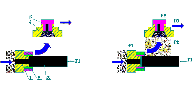 如图1所示,物料在尚未通过工作阀时,一级均质阀和二级乳化阀的阀芯和阀座在力F1和F2的作用下均紧密地贴合在一起。物料在通过工作阀时(如图2),阀芯和阀座都被物料强制地挤开一 条狭缝,同时分别产生压力P1和P2以平衡力F1和F2。物料在通过一级均质阀(序号1、2、3)时,压力从P1突降至P2,也就随着这压力能的突然释放,在阀芯、阀座和冲击环这三者组成的狭小区域内产生类似爆炸效应的强烈的空穴作用,同时伴随着物料通过阀芯和阀座间的狭缝产生的剪切作用以及与冲击环撞击产生的高速撞击作用,如此强烈地综合作用,从而使颗粒得到超微细化。一般来说,P2的压力(即乳化压力)调得很低,二级乳化阀的作用主要是使已经细化的颗粒分布得更加均匀一些。据美国Gaulin公司的资料介绍,绝大部分情况下,单单使用一级均质阀即可获得理想的效果。