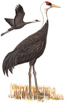 物种特征:描述:体小(97厘米)的深灰色鹤。头颈白色,顶冠前黑而中红飞行时飞羽黑色。亚成鸟头、颈沾皮黄色,眼斑黑色。 虹膜-黄红色;嘴-偏绿;脚-近黑。 叫声:响亮的 kurrk 叫声。 分布范围:繁殖于西伯利亚北部及中国东北;在日本南部及中国东部越冬。 分布状况:全球性有赖于保护(Collar et al., 1994)。不常见。可能在黑龙江的小兴安岭泥沼繁殖,但尚无资料证实。繁殖于兴凯湖、三江平原及内蒙古东部的呼伦池地区。 习性:栖于近湖泊及河流沼泽地。