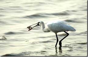 黑脸琵鹭大多数在中国的台湾省越冬,1994年曾文河口有250只、香港米浦有70只;1993年据王会调查在盐城见到47只,但1993~1994年在盐城只见到13只。1993年1月在福田保护区见到48只,在海南东寨港保护区见到13只。