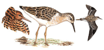 物种特征:描述:冬羽:体略大(雄鸟28厘米,雌鸟23厘米)而嘴短,暗褐色,腿长,头小,颈长,嘴直。上体深褐具浅色鳞状斑纹;喉浅皮黄色;头及颈皮黄色;下体白,两胁常具少许横斑。飞行时翼上狭窄白色横纹及于深色尾基两侧的椭圆形白色块斑极明显。雌鸟甚小于雄鸟。幼鸟皮黄色。夏季雄鸟棕色或部分白色并具明显的蓬松翎颌。 虹膜-褐色;嘴-褐色,嘴基近黄,冬季灰色;脚-多色,或黄或绿或为橙褐色。 叫声:低chuck-chuck声,但冬季通常无声。 分布范围:繁殖于北欧和亚洲;冬季至非洲及南亚,罕见迷鸟甚至到澳大利亚。 分布状况:罕见的非繁殖期候鸟。有记录迁徙时见于新疆西部、西藏南部及华东沿海和台湾。少量在广东、福建及香港沿海越冬。 习性:喜沼泽地带及沿海滩涂,与其他涉禽混群。