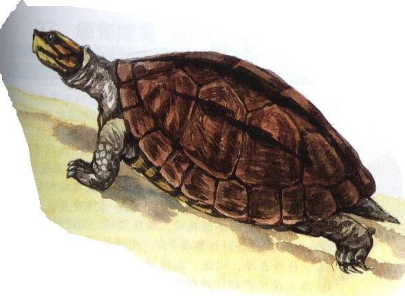 背甲长9-16厘米、宽7-10厘米。头较小,无滑无鳞,呈蜡黄色。吻较尖钝,鼓膜小而明显,眼后具红褐色椭圆斑背甲脊棱三条,中央宽而两侧不显。背腹甲和胸腹盾片间以韧带相连,甲壳可完全闭合,头、四肢和尾均可缩入壳中。背面呈棕褐色、三条纵棱为黑色;腹甲为黑色、边缘为黄色甲桥上具一黑色长纹;头背的蜡黄色和头侧的黑色界线分明指、趾间具全蹼,爪细而弯。