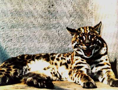 金猫别名原猫、红椿豹、芝麻豹、狸豹、乌云豹,属于猫科。金猫比云豹略小,体长80~100厘米。尾长超过体长的一半。耳朵短小直立;眼大而圆。四肢粗壮,体强健有力,体毛多变,有几个由毛皮颜色而得的别名:全身乌黑的称“乌云豹”;体色棕红的称“红椿豹”;而狸豹以暗棕黄色为主;其他色型统称为“芝麻豹”。