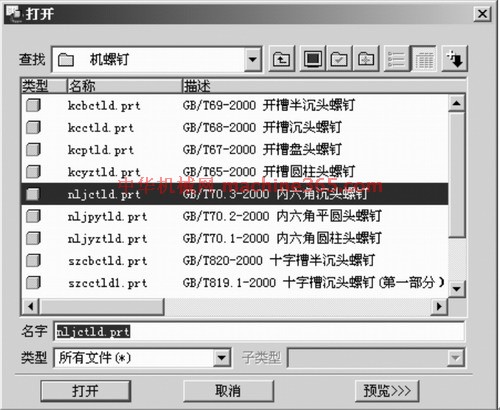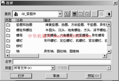 从图2中可以看出,设计师可以根据描述中所示国家标准号或标准件名称进行选择,再进一步的选择与Pro/ENGINEER中原来的标准件选择一样,此处不再表述。