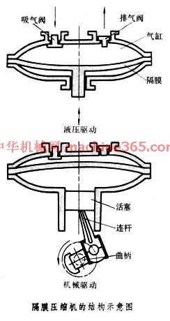 )比较常见﹐其排气量可达100米3/小时﹐多级压缩的排气压力可超过 100兆帕﹐适用于各种气体的输送和加压﹐也可用作无油润滑压缩机之后的增压压缩机。金属隔膜的厚度一般取0.3~0.5毫米。隔膜的寿命取决于选用的材料及其表面粗糙度。由于液压驱动的运动质量较大﹐液压部分的活塞平均速度只能取2米/秒﹐因而机器的转速通常在300~500转/分的范围内。隔膜压缩机的气缸工作容积表面积与气缸体积的比值比往复活塞压缩机大得多﹐气体的压缩接近于等温过程﹐故每级的压力比可高达25。隔膜压缩机由于气缸密封性好﹐压缩的气体不受污染﹐适合于小排气量时的各种用途。如用作小型供气装置﹑气动调节器﹑水族馆饲养池的通气装置﹐以及化学工业中无油﹑有毒﹑有腐蚀性﹑贵重的或有放射性气体的输送和加压。