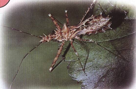 成虫体长14-15毫米,宽2.5-2.7毫米。身体黄 褐色,具有许多刺状突;头部两侧、眼部两侧斜带、 小盾片中部、前翅前缘脉的前中部、革片大部以及胸 侧板,其色斑均为黑褐色。前胸背板前叶有10个刺突 中部中央的2个较大,两刺突间具纵沟。后叶有4个 显著的大刺。腹部第3节的端角呈刺突状,其他各节 的端角呈片叶刺状。雄性的生殖节瑞缘中央呈宽铲状 并向外突出。