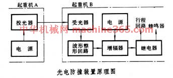 防止起重机在意外情况下损坏的装置。起重机上除常用的电气保护装置﹑声音信号和色灯外﹐还有多种其它安全装置。 行程开关 防止起重机各种运动机构超过极限位置的安全装置。当各种运动机构到达极限位置时﹐行程开关被触动﹐从而切断电源。 缓冲装置和防撞装置 用以吸收开关失灵时起重机或小车撞到终端挡座上时的动能。这种装置广泛采用橡胶﹑弹簧和液压式的缓冲器﹐其中液压式缓冲器用在工作速度高的起重机或小车(如运载桥的小车)上﹐它能在撞击时吸收较大的能量。在某些起重机上还装有光电防撞装置﹐以避免同一轨道上两台运行中的起重机相互碰撞。它的简单原理(见图 光电防撞装置原理图 )是﹕当两台起重机接近到一定安全距离时﹐起重机 A的投光器发出的光波被起重机 B的受光器接收﹐通过光电管产生电信号﹐经波形整形和放大后﹐继电器动作﹐蜂鸣器发出警报并自动切断运行机构的电源。两台起重机要各装一套﹐相互作用。 防风装置 防止起重机被大风吹移或刮倒的装置﹐主要有起重机夹轨器和起重机锚定器。在港口上运行的大型起重机上通常同时装设夹轨器和锚定器。夹轨器在起重机停歇或风力增大到一定级别时起作用﹔锚定器是在暴风来临前由司机操作的。夹轨器的防风作用不如锚定器。 起重量限制器 可使起吊的重物重量不超过规定值﹐有机械式和电子式两种。机械式利用弹簧-杠杆原理﹔电子式通常由压力传感器检测起吊重量﹐当超过允许的起重量时起升机构便不能激活。起重量限制器也可兼作起重量指示器用。 起重力矩限制器 可以使臂架型起重机的起重力矩(起重物的重力和幅度的乘积)不超过规定值﹐能同时接收起重量变化信号和幅度变化信号。两种信号经电子仪器组合运算并放大后与起升和变幅机构实现电气联锁﹐以防止起重机翻倒。 偏斜限制器 大跨度起重机(一般在50米以上﹐如运载桥和造船用大型门座起重机)在两侧运行速度不一致时﹐易产生偏斜而增大运行阻力﹐使桥架和支腿的联接结构承受附加载荷。这时﹐通常在柔性支腿的上部安装偏斜限制器。起重机桥架与支腿间的相对转动可通过臂杆或齿轮副的运动﹐使凸轮或凸块触动控制开关﹐当起重机在达到最大偏斜量的一定值(一般为起重机跨度的千分之三至千分之五)时可切断电源或自动纠偏。