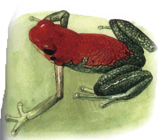 身长只有2-4厘米。眼甚大,带黑色。指、趾间均无蹼。体色十分艳丽,皮肤腺发达,分泌液中富有独特的生物碱,毒液能使人麻痹,甚至丧命。很久以前,南美洲雨林中的印地安人便把这种毒液收集起来,涂在箭头上,用以制故。箭毒蛙的这种分泌液带有鲜艳的颜色,用来吓唬天敌,这也是它的自卫方法。