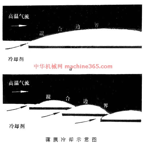 把温度较低的气体冷却剂通过切向缝隙输送到需要热防护的壁面上﹐沿著高温气流的流向形成薄膜 (图中a 薄膜冷却示意图