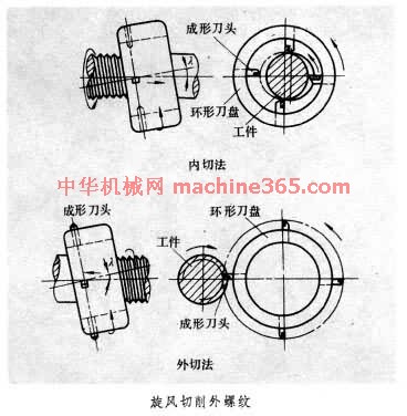 )。旋风头的环形刀盘的外圆周(外切法)或内圆周(内切法)上装有均匀分布的数把硬质合金成形刀头﹐由1台电动机驱动作高速旋转。一般采用4把刀头﹐其中2把用于粗切螺纹﹐1把用于倒角﹐1把用于精切螺纹。刀盘轴线相对工件轴线倾斜一个螺旋升角。工件由机床主轴驱动作低速旋转﹐工件每转1转旋风头移动1个螺距或导程。内切法与外切法比较﹐刀头与工件接触弧较长﹐加工表面质量较高﹐刀具寿命较长﹐故应用比外切法广泛。加工内螺纹时﹐只能采用外切法。旋风切削梯形螺纹的精度一般可达 7~9级(JB2886-81)。表面粗糙度为R