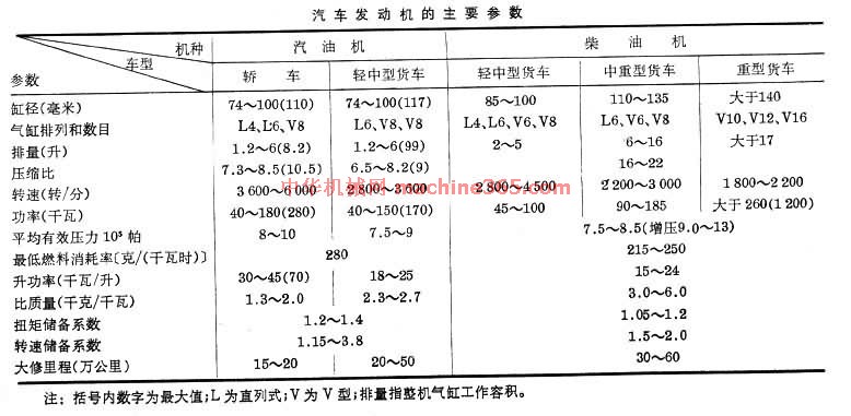 用作汽车动力的发动机。绝大多数汽车使用以汽油或轻质柴油为燃料的往复活塞式内燃机。汽车主要用于运输﹐要求有质小﹑轻巧﹑省燃料﹑适应性好且可靠耐用的动力装置。汽油机升功率(每升气缸排量的功率)高﹐比质量(每单位功率的质量)小﹐起动方便﹐振动和噪声小﹐用于绝大部分轿车和轻型货车﹑部分中型客车和货车。柴油机燃料消耗率低﹐大修里程长﹐用于重型汽车和大部分中型货车﹐也用于客车。由于能源关系﹐柴油机的使用范围不断扩大。表 汽车发动机的主要参数