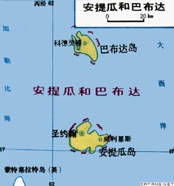 | 安提瓜和巴布达 Antigua and Barbuda 位于东加勒比海背风群岛南端的英联邦成员国。面积441.6平方千米,其中安提瓜岛280平方千米,巴布达岛160平方千米,无人居住的雷东达岛1.6平方千米。人口8.4万(1991),非洲黑人后裔占总人口的94.4% 。英语为官方语言和通用语。多数居民信奉基督教。首都圣约翰。
