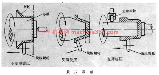 )。旋压可製造各种轴对称旋转体零件﹐如扬声器﹑弹体﹑高压容器封头﹑铜锣﹔也可用於气瓶收口﹑筒坯成形等。旋压的特点是﹕用很小的变形力可成形很大的工件﹔使用设备比较简单﹐中小尺寸的薄板件可用普通车床旋压﹔模具简单﹐只需要一块芯模﹐材质要求低。旋压适用於小批生產﹐因其只能加工旋转体零件﹐局限性较大﹐生產率低。旋压可用专门机械﹐採用仿形旋压和数字控制旋压。在旋压成形的同时使板厚减薄的工艺称为变薄旋压﹐又称强力旋压﹐多用於加工锥形件﹑薄壁的管形件等﹐也可用以旋压大直径的深筒﹐再剖开后製成平板。