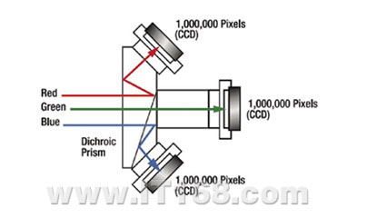 图像感光器数量即数码摄像机感光器件CCD或CMOS的数量。多数的数码摄像机采用了单个CCD(电荷耦合元件)做为其感光器件,一些低端的数码摄像机会采用CMOS,由于使用CMOS作感光器件的数码摄像机比较少,在这里就不作讨论。而接近专业级的数码摄像机是用3CCD作为其感光器件。3CCD影像感应器以特制的光学菱镜,能将光源分成红、绿、蓝叁原色光,这叁原色光分别经过叁块独立CCD影像感应器处理,颜色的准确程度及影像素质比使用一块CCD影像感应器大为改善。