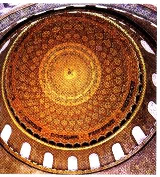 起初,岩顶清真寺的上部内外是一样的金色镶嵌砖图案,后经过不断重修,才变成了现在看到的彩色图案。