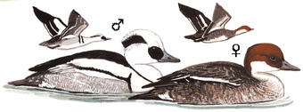 物种特征:描述:体型小(40厘米)而优雅的黑白色鸭。繁殖期雄鸟体白,但眼罩、枕纹、上背、初级飞羽及胸侧的狭窄条纹为黑色。体侧具灰色蠕虫状细纹。雌鸟及非繁殖期雄鸟上体灰色,具两道白色翼斑,下体白,眼周近黑,额、顶及枕部栗色。与普通秋沙鸭的区别在于喉白色。 虹膜-褐色;嘴-近黑;脚-灰色。 叫声:通常无声。雄鸟发情时发出呱呱低声及啸音。雌鸟发出低沉的哮声。 分布范围:北欧及北亚,越冬于印度北部、中国及日本。 分布状况:繁殖于内蒙古东北部的沼泽地区,冬季南迁时经过中国大部分地区。分布广泛但通常并不常见。 习性:栖于小池塘及河流,在树洞中繁殖。
