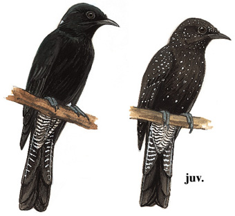 物种特征:描述:中等体型(23厘米)的黑色杜鹃。全身体羽亮黑色,仅腿白,尾下覆羽及外侧尾羽腹面具白色横斑,前胸隐见白色斑块。幼鸟具不规则的白色点斑。尾羽开如卷尾。 虹膜-褐色(雄鸟),黄色(雌鸟);嘴-黑色;脚-蓝灰色。 叫声:叫声响亮清晰,由4~6个均匀的pi声平稳上升,之前有过门声;也作一连串快速颤音,升至最后三个音而降调。 分布范围:印度、中国、印度尼西亚及菲律宾。 分布状况:罕见留鸟及候鸟,见于海拔900米以下的低地处。亚种dicruroides 繁殖于四川南部、云南、西藏东南部、贵州、广东及福建。在海南岛为留鸟。 习性:栖于林中、林缘及次生灌丛。性羞怯。外形似卷尾,但姿势、动作及飞行均不同。