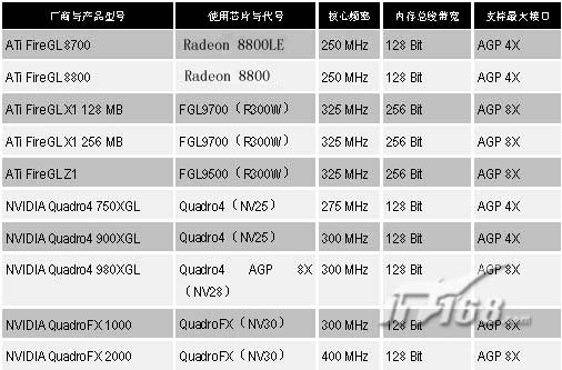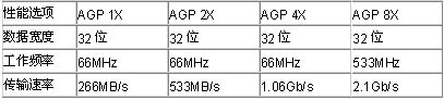 目前工作站显卡几乎全部采用AGP(Accelerated Graphics Port)接口。有AGP1X、AGP2X、AGP4X、AGP8X几种规格。如下表