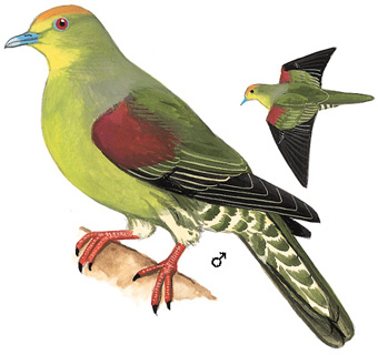 物种特征:描述:中等体型(33厘米)的绿鸠。肩斑褐色,臀及尾下覆羽具绿色及白色鳞状斑。雄鸟胸绿,喉黄,顶冠橘黄。与楔尾绿鸠区别在上背灰绿,尾部斑纹不同,眼红色。眼周裸皮蓝色。 虹膜-红色;嘴-蓝色;脚-红色。 叫声:po po peh声,最后的音节调高。 分布范围:琉球群岛、中国台湾及菲律宾。 分布状况:全球性近危(Collar et al., 1994)。指名亚种为台湾南部及兰屿岛的不常见留鸟。 习性:典型的本属特性。栖于热带低地常绿林
