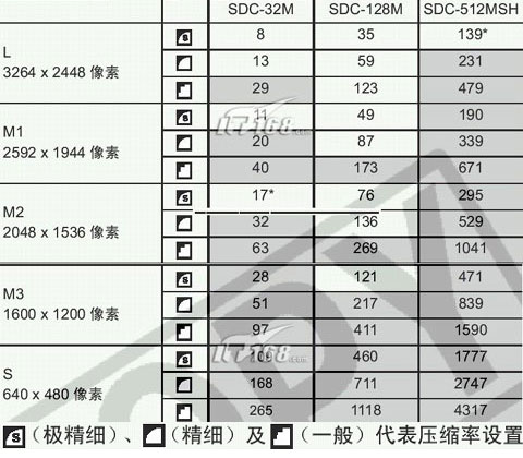 (1)下面以不同容量的SD卡为例,列出不同分辨率、不同压缩率条件下可以拍摄静态图片的张数(如下图)。