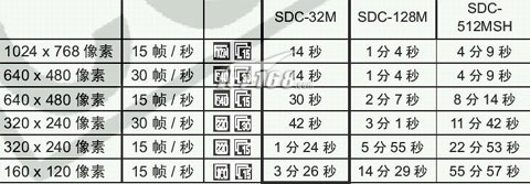 (2)下面以不同容量的SD卡为例,列出不同分辨率、不同帧率条件下可以拍摄动态短片的时间(如下图)。