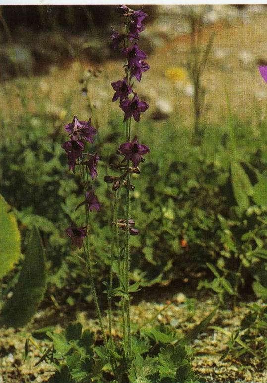 形态特征:毛茛科翠雀属草本植物,高22-80厘米。茎通常不分枝,疏被白色硬毛。基生叶数枚,具长柄,茎生叶1(-4)枚,具较短柄;叶片肾形或近五角形,长3-6.5厘米,宽5.5-11厘米,3深裂稍超过中部,中央深裂片菱形或楔状菱形,3浅裂 侧深裂片斜扇形,不等2裂近中部;叶柄长达12厘米。7-8月开花,总状花序狭,具5-12朵忍 小苞片生花梗上部距花3-5毫米处,狭披针形;萼片蓝紫色,上萼片卵形,其他萼片倒卵形,长1.2-1.7厘米;距圆简状钻形;花瓣黑色,近无毛。