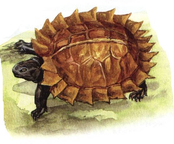 背甲约长10厘米,宽约7厘米左右。头小,灰棕色,自吻端两侧沿眼部至颈侧有2条黄白色浅纹。背甲平滑,黄棕色;具3条纵棱,脊棱尤为明显。腹甲大,中央黑色,周缘浅黄。四肢灰棕色,鳞片发述,指、趾间半蹼。尾短,略扁平,基部两侧各有3枚锥状鳞。吻端尖圆,上喙略钧曲,咽部具颗粒状鳞片,颈部鳞大,覆瓦状k排列;鼓膜小但明显。
