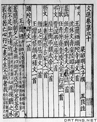 《文选》 中国现存最早的诗文总集。南朝梁昭明太子萧统编选,故世称《昭明文选》。据《隋书·经籍志》记载,自晋至隋,诗文总集共有249部,早于《文选》的有挚虞的《文章流别集》、李充的《翰林论》、刘义庆的《集林》等,但它们均已亡佚。因而《文选》就成为所能见到的最早的也是影响最大的总集。另据《梁书·昭明太子传》记载,萧统以太子之尊引纳了许多文士,当时颇负盛名的刘孝绰、王筠、殷芸、陆倕、刘 勰等人,都曾做过太子僚属。他们很可能参加过《文选》的编选工作。《文选》收入先秦至隋130家的作品514题。共30 卷。从文体上分为赋、诗、骚、七、诏、册、令、教等38类,归纳起来大致可分为诗歌、辞赋、杂文三大类。其中赋又有京都、郊祀、耕籍等15门;诗歌又有补亡、述德、劝励等23门。这种体例编排,反映了编者关于文体源流及其辨析方面的见解,同时存在着过于琐碎的毛病。《文选》所选的130家,都是各时期的代表性作家,如屈原、宋玉、司马相如、司马迁、扬雄、班固、张衡、三曹父子、刘桢、王粲、陆机……,同时又详近略远,故其所选作品以晋以后者居多。选录标准是以“文为本”,不选经、子,史书也只略选论赞,表明编者已为文学划定了范畴,初步注意到文学与其他著作的区分。编者主张文质并重,但在选录时比较注意辞采、骈偶和声律,因而有不少好文章未能入选。《文选》对后世的影响十分深远。唐宋时代科举考试以诗赋取士,《文选》自然也就成为应考的必读书。有“《文选》烂,秀才半”的谚语。隋唐以后,研究《文选》成了一种专门的学问,研究专著不计其数。今存90余种。有唐代李善的《文选注》,《文选注》现存版本有清嘉庆年间胡克家重刻宋刊本、附《考异》10卷等。