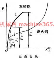 中为灰铸铁和退火钢的压缩曲线。曲线中纵坐标P 为压缩载荷﹐横坐标Δ为试样承受载荷时的压缩量。如将两坐标值分别除以试样的原截面积和原高度﹐即可转换成压缩时的应力-应变曲线。图 压缩曲线