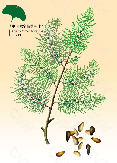 原植物形态 常绿乔木,高达20m,胸径可达1m。树皮薄,浅灰褐色,纵裂成条片;小枝扁平,直展,排成一平面。鳞形叶交互对生,长1~3mm,先端微钝,位于小枝上下两面之叶的露出部分倒卵状菱形或斜方形,两侧的叶折覆着上下之叶的基部两侧,叶背中部均有腺槽。雌雄同株;球花单生于短枝顶端;雄球花黄色,卵圆形,长约2mm。球果当年成熟,卵圆形,长1.5~2cm,熟前肉质,蓝绿色,被白粉;熟后木质,张开,红褐色;种鳞4对,扁平,背部近顶端有反曲的尖头,中部种鳞各有种子1~2颗。种子卵圆形或长卵形,长4~6mm,灰褐色或紫褐色,无翅或有棱脊,种脐大而明显。花期3~4月,球果9~10月成熟。