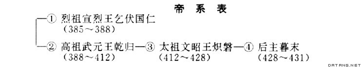 鲜卑乞伏氏在汉魏时自漠北南出大阴山,迁往陇西并定居于此。前秦主苻坚在位时,乞伏鲜卑酋长、国仁父乞伏司繁被命为镇西将军,镇勇士川(今甘肃榆中东北)。司繁死,国仁代镇。淝水之战,苻坚败亡,国仁招集诸部,众至10余万。385年,国仁自称大将军、大单于、领秦河二州牧,筑勇士城为都(在勇士川内,后即苑川郡城) ,史称西秦。388年六月国仁死,弟乞伏乾归继位,称河南王,迁都金城(今甘肃兰州西北)。394年前秦主苻登败死,乾归尽有陇西之地,改称秦王。400年迁都苑川。同年败于姚兴,遂降附后秦 ,为其属国。407年乾归姚兴留居长安,两年后回到苑川,复称秦王。412年乾归死,子乞伏炽磐继位,称河南王,迁都袍罕(今甘肃临夏)。414年攻灭南凉,十月改称秦王。428年六月炽磐死,子乞伏暮末继位,政刑酷滥,民多叛亡;又屡为北凉主沮渠蒙逊所侵逼。430年暮末欲东趋上邽(今甘肃天水),归附北魏,途中遭夏主赫连定阻击,退保南安(今甘肃陇西东南) 。431年一月夏军攻围南安,暮末出降,西秦亡。 |