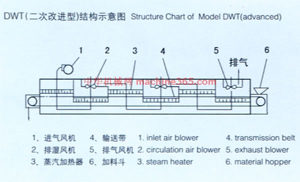 原理如图所示。料斗中的物料由加料器(6)均匀的铺在不锈钢丝网(4)上,由传动电机带动网带在干燥箱内匀速移动。干燥段由若干单元组成。热风在两个(或几个)单元内横向循环。新鲜空气由风机(1)进入。通过换热器(3)加热。热空气穿过物料层与物料热交换。进入下腔。然后流向下一单元。降温后的热空气再经换热器(3)进行二次加热,热空气穿透网带与物料再次热交换。湿热空气由排湿风机(2)(5)排出。完成干燥,每台干燥机单元数可根据物料的特性、工艺要求选取。